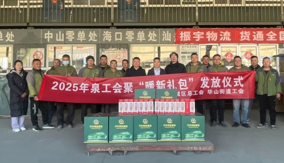 寒天暖意,工會同行。為深入踐行市、區(qū)總工會關(guān)于關(guān)心關(guān)愛新就業(yè)形態(tài)勞動者的工作部署,12月8日,華山街道工會“泉工會聚‘暖新禮包’發(fā)放活動”走進振宇物流集團,將暖心關(guān)懷精準送達基層一線。華山街道黨工委副書記連東坡、工會副主席王曉鳴一行深入企業(yè),為新就業(yè)形態(tài)勞動者親手送上滿載關(guān)懷的“暖新禮包”,切實讓職工感受到工會組織的溫暖與力量。振宇物流集團董事長張憲振、總經(jīng)理孫松、工會主席張貴強全程陪同,對華山街道及工會領(lǐng)導的關(guān)心支持表示衷心感謝。